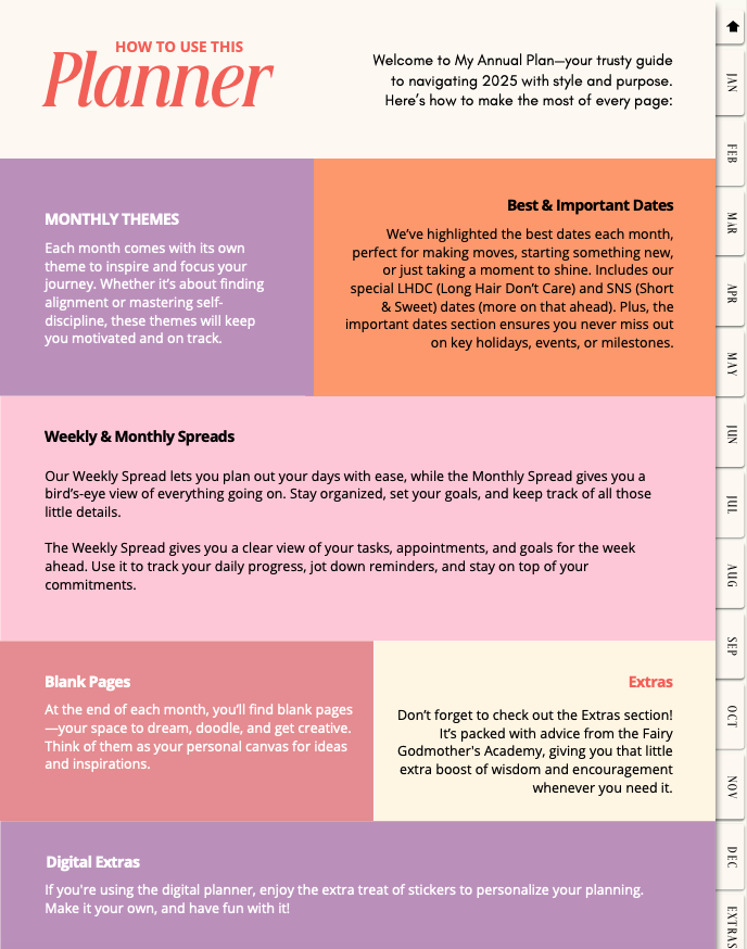 My Annual Plan Your Fairy Godmother prioritizes your month with key dates PRINT AVAILABLE ON AMAZON GET 2025 DIGITAL PLANNER Take a look inside Celestial Guidance Self-Care Prompts Weekly Pages Monthly Overviews PRINT AVAILABLE ON AMAZON GET 2025 DIGITAL PLANNER